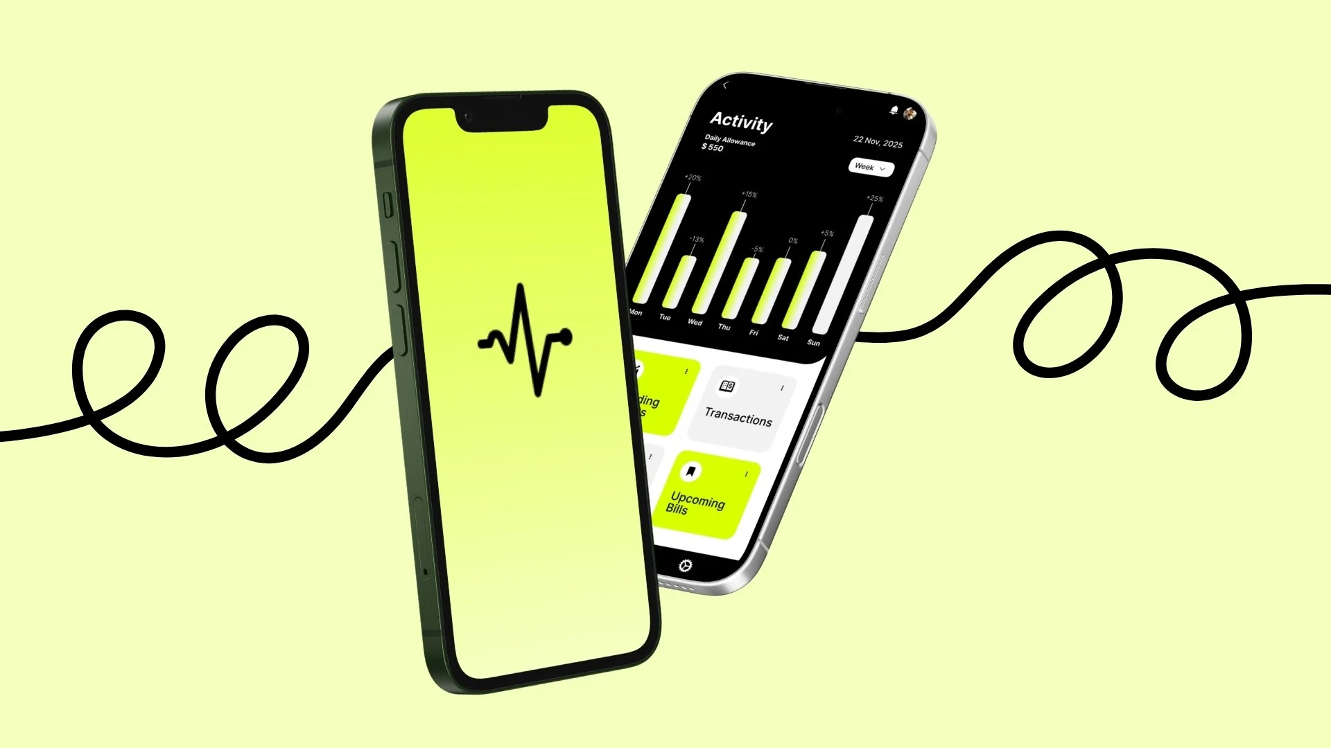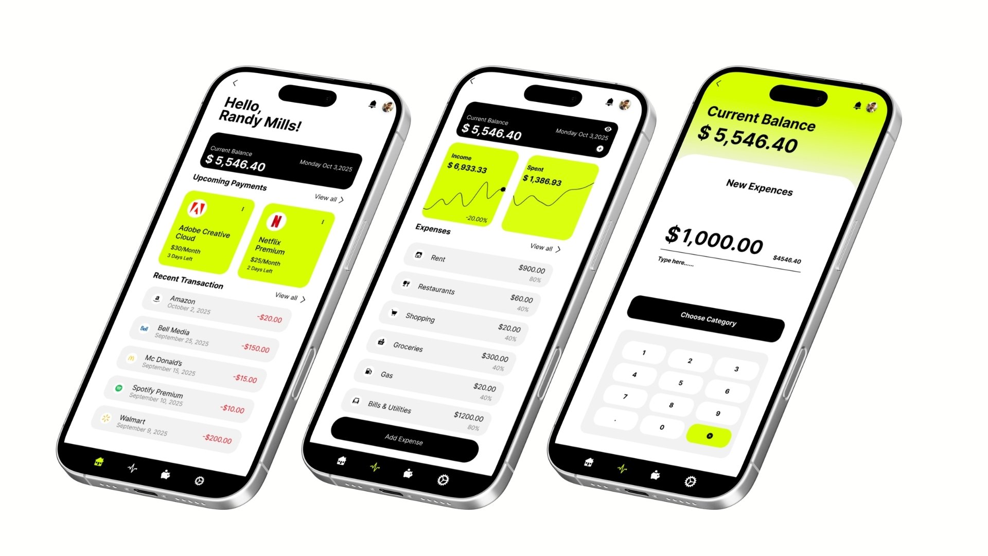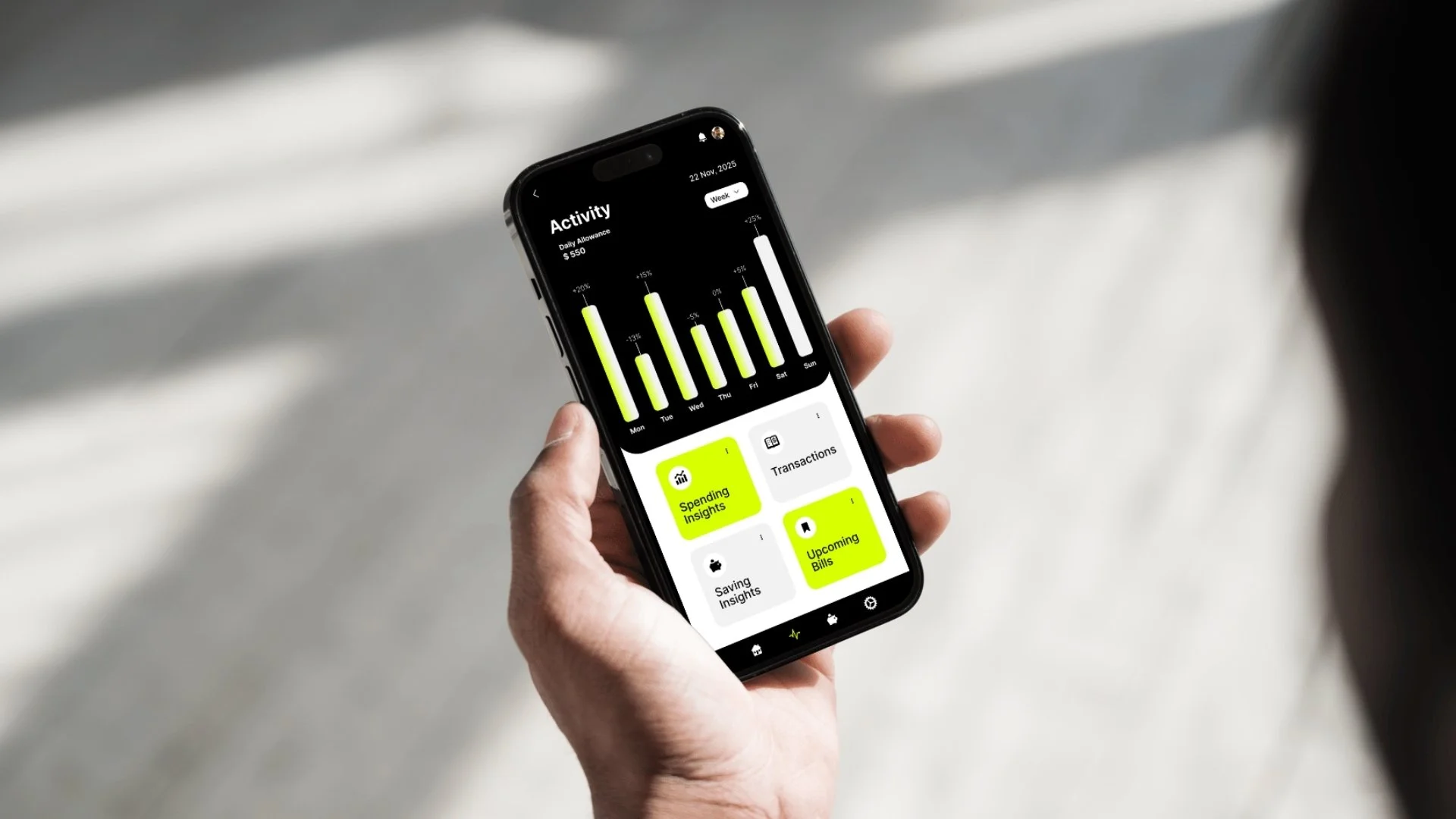 This screen was designed to make financial habits feel instantly readable and actionable. By combining a weekly activity chart with quick-access insight cards, the interface helps users understand spending patterns, review transactions, and stay aware of upcoming bills at a glance. The high-contrast black-and-white base is paired with a bright accent colour to direct attention toward key actions and important data, creating a visual system that feels both modern and motivating. The result is a dashboard that turns financial tracking into a clearer, less overwhelming daily experience.
