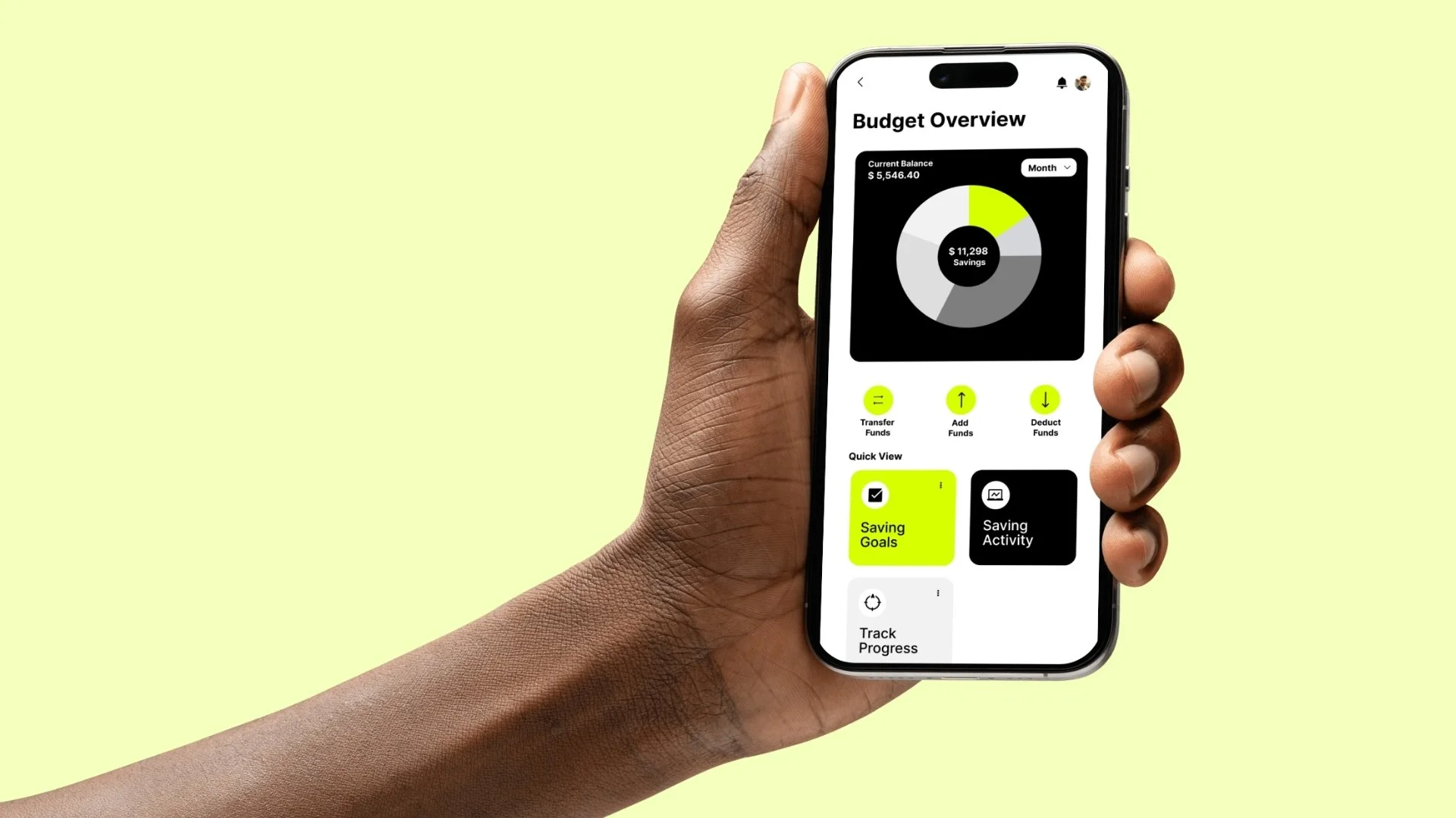 Budget Overview presents a clear snapshot of the user’s financial position in one glance. A central savings visualization turns financial data into an easy-to-read focal point, while quick actions like transferring, adding, or deducting funds support fast daily interaction. Supporting modules such as Saving Goals, Saving Activity, and Track Progress extend the experience beyond simple monitoring, encouraging active financial management and long-term habit building. The high-contrast palette and bright accent colour establish strong hierarchy, draw attention to key actions, and keep the interface feeling modern, clean, and approachable.